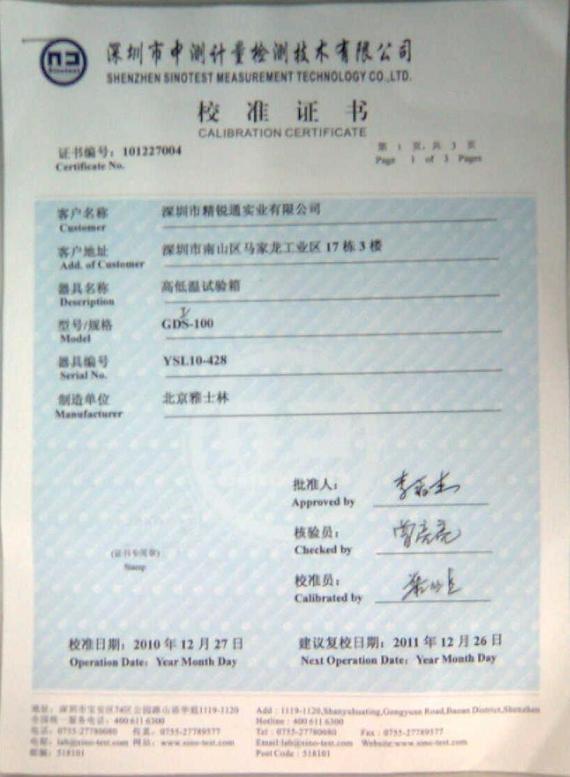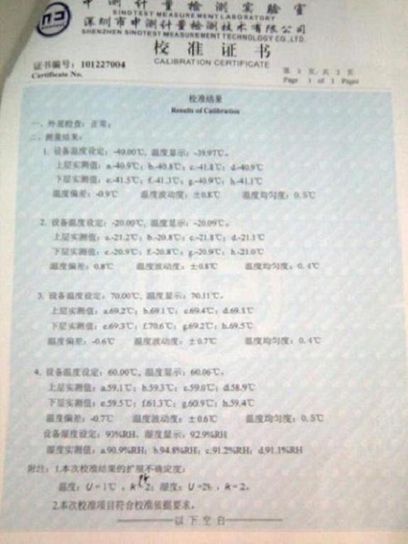 高低溫交變濕熱試驗(yàn)箱校準(zhǔn)證書-深圳中測計量-深圳精銳通