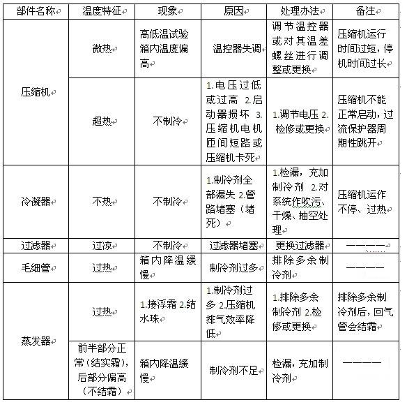 眾所周知,溫度是表示物體的冷熱程度的物理量,是制冷工程的一個重要的技術(shù)參數(shù)。高低溫試驗箱的主要部件是:壓縮機(jī)、冷凝器、過濾器、毛細(xì)管、蒸發(fā)器等,也就是說,他們的工作溫度特征反映了整個制冷系統(tǒng)的運(yùn)行狀況。我們在判斷高低溫試驗箱是否存在故障時,最行之有效的方法就是用手去摸各部件的表面溫度。然而,他們的溫度特征怎樣才算正常,請看下表。